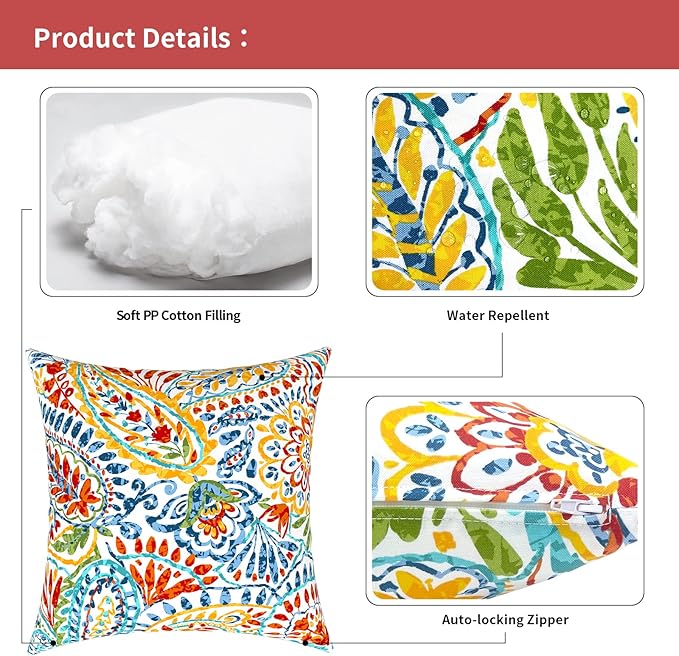 Outdoor Pillows for Patio Furniture 18x18 inch, Square Outdoor Throw Pillows with Inserts, Decorative Toss Pillows for Garden Couch Home Sofa Office Chair, Pack of 2, Paisley Multi