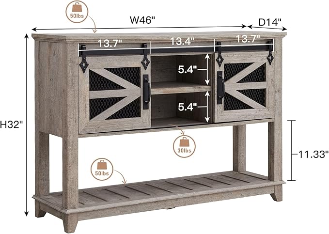 - STUNNING: Product Measured: 46"W × 14"D× 32"H. If you’re looking for a striking addition to your living space, this OKD farmhouse console table makes a statement. It features a perfect blend of industrial & modern farmhouse styles. Enhancing its charm, sliding barn doors with mesh accents give it just enough flair. It is ideal for showcasing your favorite things. The distressed oak finish delivers a naturally aged feel and creates a cozy and retro vibe, making it a classic piece for your home