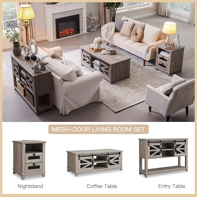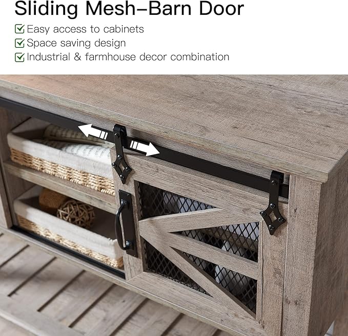 - SLIDING BARN DOORS: Featuring two removable barn doors for convenient slide and space-saving. The sliding barn doors are designed with inset metal mesh and dark iron tone hardware for added charm and aesthetic, giving the table a characteristic look. Quality slide ensures smooth slide for convenient access to cabinets while space saving. You can also choose to slide the door to any side to conceal side storage cabinets or the middle open-cubby for a clean, organized look