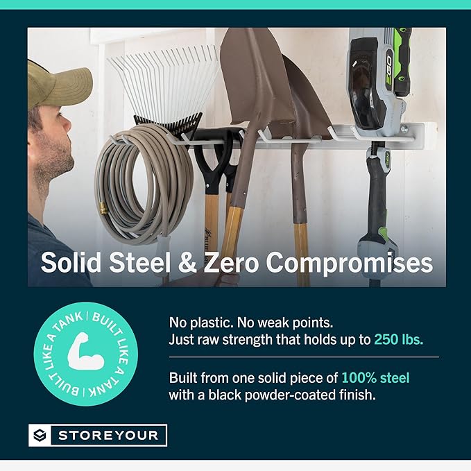 - ULTRA-STRONG & BUILT TO LAST – Made from 100% solid steel with no plastic parts or assembly required, this tool rack is crafted to withstand heavy-duty use. Each wall-mounted storage rack arrives fully welded and powder-coated to resist rust and corrosion. Perfect for organizing tools, outdoor storage gear, or even a fishing pole rack for the garage.