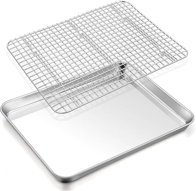 - Healthy & Heavy Duty: TeamFar baking sheet with rack is made of premium stainless steel no toxic coating or harmful substance release into your food at high temperatures, Rust and corrosion resistance, Healthy for daily using, Baking tray and rack constructed with heavy gauge steel, Sturdy and durable for lasting a long term, Superior to aluminum pans and racks