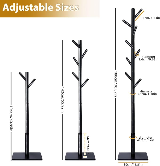Yawinhe Coat Rack, Sturdy Woode Stand Tree with 8 Hooks, 3 Adjustable Height for Bedroom, Hallway, Entrance, Office, 11.8 x 70.8 inches, Black, 1-Pack, Square Base