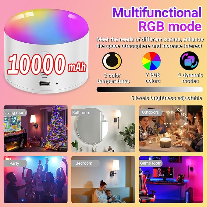 - Upgrade RGB ambient lighting: Our Battery powered wall lights let you customize your lighting like a painter with their palette. Each wall sconce offers 7 RGB colors and 2 dynamic modes, as well as 3 color temperatures to choose from,you can choose your favorite colors for different occasions and moods. Rechargeable, includes USB charging cable (Type-C).