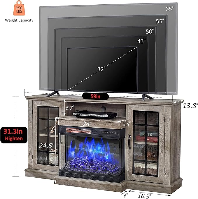 - Fits TVs 65''+ - AMERLIFE 59'' TV Cabinet can accommodate TVs up to 65'', including a 24'' fireplace. TV Stand Dimensions: 59 W x 13.8 D x 31.3 H in; Fireplace Dimensions: 24 W x 11 D x 18.5 H in.