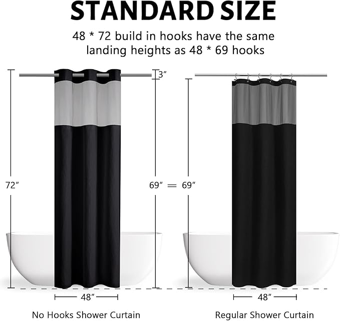 - Product Dimensions: This no hook shower curtain measures 48" width x 72" length that fits most bathtub and showers. It also comes with a detachable liner of 48"W x 52"L that is removable, easy to clean and machine washable