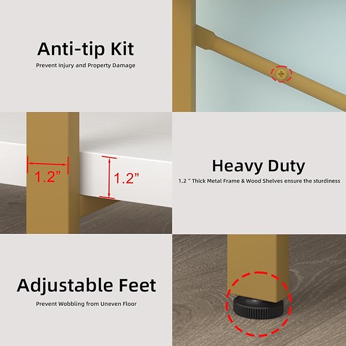 - 【Anti-tip Kits & Easy Assembly 】:Please remember to install the anti-tip kits on the wall for better stability and less unexpected injuries. With smart design and all tools included, you never get stuck with the hard assembly jobs for the white and gold wood bookcases .