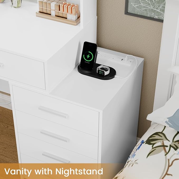 - Vanity and Nightstand 2 in 1 Design: The lighted makeup vanity is designed with a bedside table on the right side, you can put the vanity desk next to the bed so that it can have two uses. It doesn't take up too much bedroom space and give you more extra storage. What a great design, is the best gift on Valentine's Day, Mother's Day, Christmas, a girlfriend's birthday, or a housewarming celebration