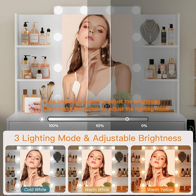 - 3 Lighting Colors & Brightness Adjustable: The vanity desk is equipped with a large mirror and 10 LED lights, can switch 3 color modes(white, natural, warm white) and the brightness of each color of light can be adjusted, meet your needs for different environments and makeup looks. So you can take care of all small blemishes and head out with flawless makeup