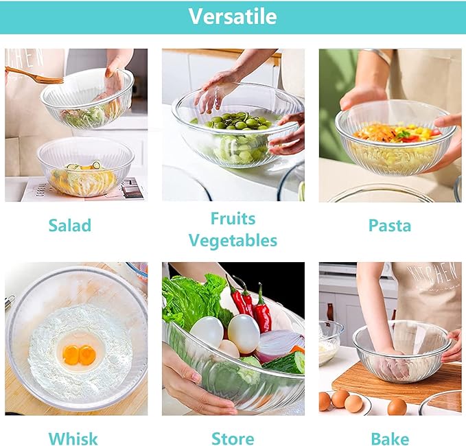 - 【 High Temperature Tolerance 】: The glass mixing bowl are made of high brosilicate material, and tolerates -4℉ to 1040℉ ,access to microwave,oven,fridge and freezer directly(exclude the lids).
