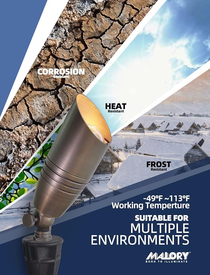- BRASS LIGHT FIXTURE:MALORY landscape spotlight is constructed of die-cast brass for durability and beauty.Brass spot light doesn't corrode,more durable and reliable than aluminum and plastic fixtures,ideal for any uplighting application.Simple design structure for the light fixture make it looks beautiful yet unobtrusive in any landscape,suitable for decorating most houses and yards.