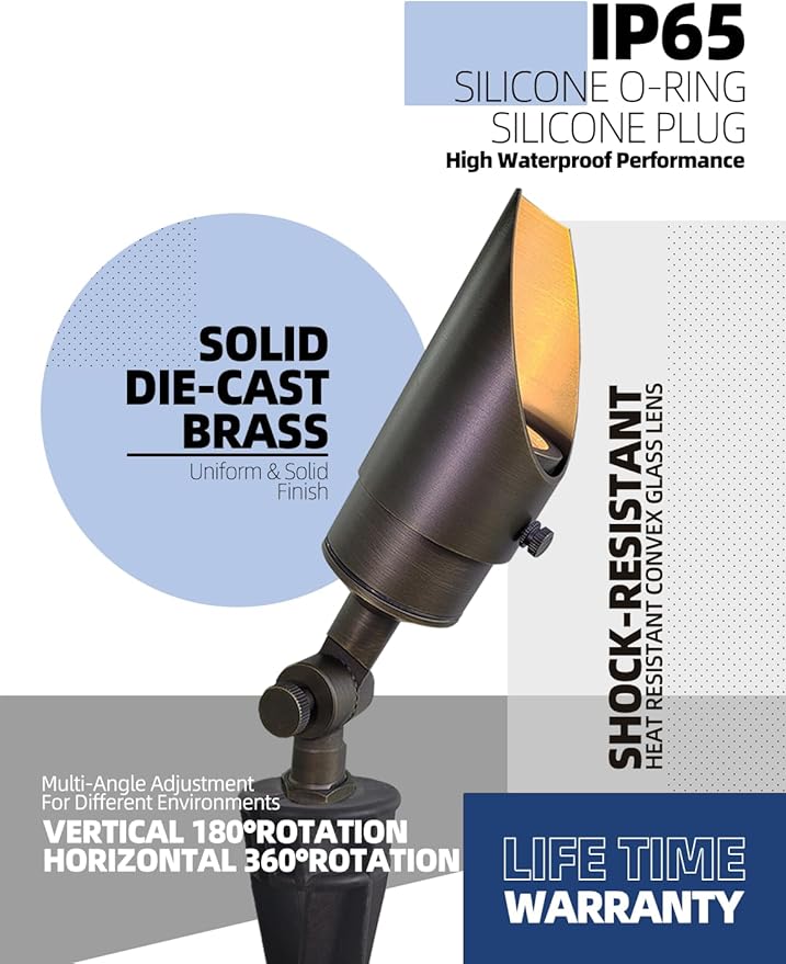 - BRASS LIGHT FIXTURE:MALORY landscape spotlight is constructed of die-cast brass for durability and beauty.Brass spot light doesn't corrode,more durable and reliable than aluminum and plastic fixtures,ideal for any uplighting application.Simple design structure for the light fixture make it looks beautiful yet unobtrusive in any landscape,suitable for decorating most houses and yards.
