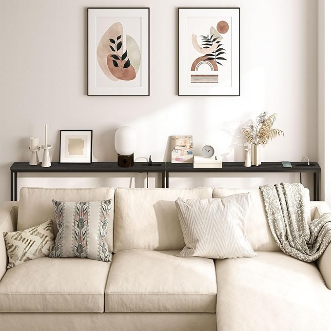 - Behind Couch Table with Outlets: The narrow console table comes with built-in 2 plug outlets, 2 USB ports and a 59" long power cord. With all the functions required for charging, the skinny sofa table is ideal for your mobile phone, laptop, desk lamps or tablets