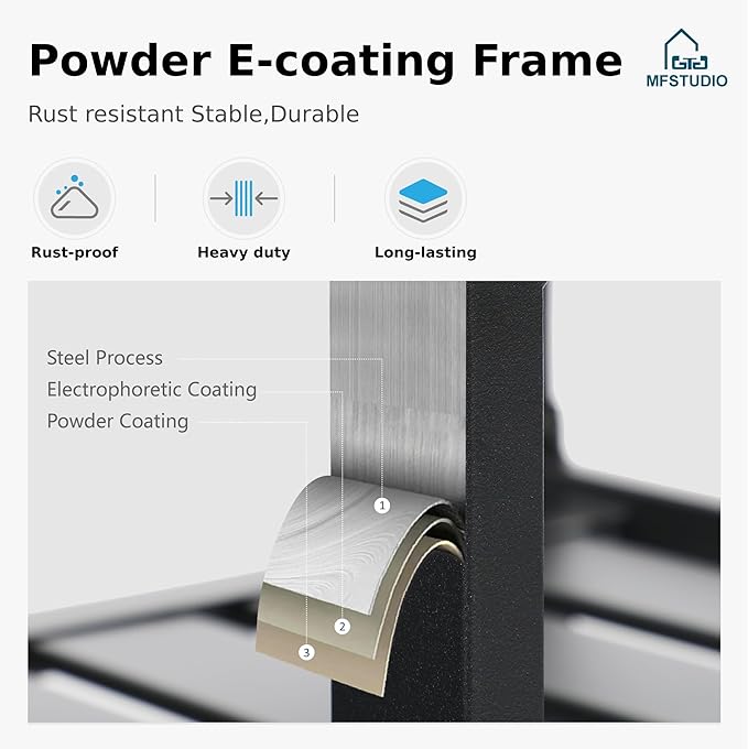 - 【Sturdy & Durable】:Ultimate rust protection!Heavy-duty elegant black steel frame premium quality, we apply industry-leading 3-step corrosion protection to all our steel frames. 1st - Meticulous cleaning pretreatment, 2nd- Electrocoat bath adds protection layer inside and out, 3rd- Final powdercoat provides superior durability and toughness.