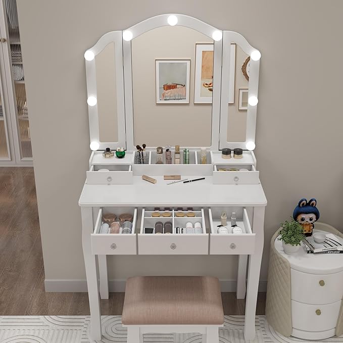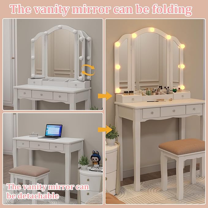White Vanity Desk with Mirror and Lights Makeup Vanity Set Teen Vanity Mirror with Lights Desk and Chair Makeup Vanity Table Makeup Vanity with Drawers Tocadores