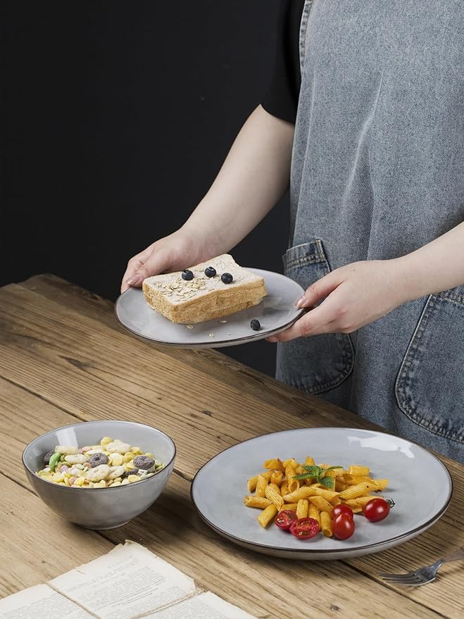 Famiware Dinnerware Sets for 4, Ocean Round 12-Piece Kitchen Plates and Bowls Sets, Reactive Glaze, Microwave and Dishwasher Safe, Scratch Resistant, Grey