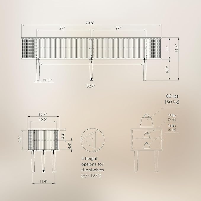 - ENJOY EFFORTLESS STORAGE as you can choose between 3 set heights for the adjustable shelf to maximize the use of the six storage spaces hidden behind the sliding doors. The TV stand cabinet (width 70,9 ‘’ x height 21,7’’ x depth 15.7’’) offers easy access to most frequently used cables, remotes, DVDs, video games and other accessories.