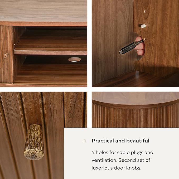 - BRING CHARACTER TO YOUR HOME by using a walnut modern tv stand which curvy corners and smoothly sliding tambour doors makes it a perfect accent cabinet. Aesthetic appeal makes it suitable for both living room tv stand and bedroom tv table. You will receive 2 sets of door knobs - wood & messing.
