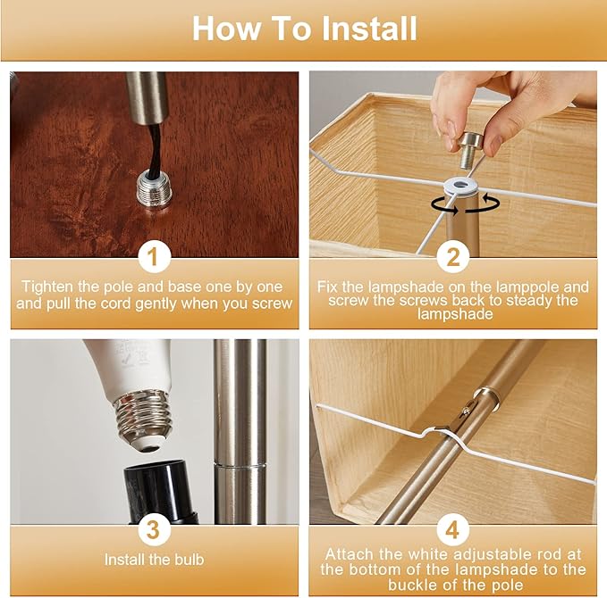 - 【Attention】The base of this lamp is made of heavy solid wood, which means it won't fall over easily and can hold well without loosening easily. The lampshade is made of folding paper. Please take care with it and be sure to install the floor lamp following the instruction. Attach the white rod at the bottom of the inner lampshade to the buckle of the adjustable pole. And adjust the buckle up and down so as to adjust the tightness of the lampshade.