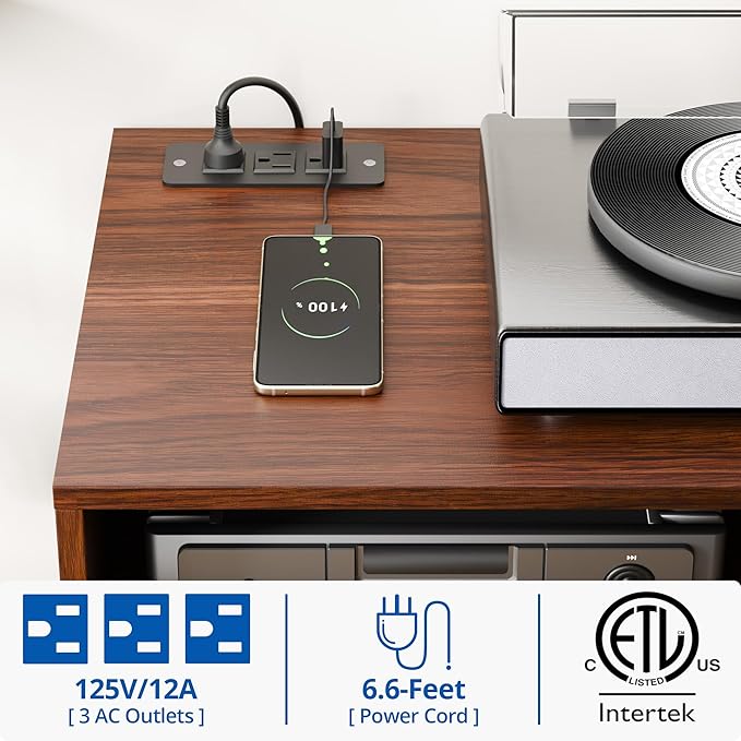 - Power Outlets and Cable Management: Equipped with 3 AC power outlets (125V/12A), this TV entertainment center doubles as a convenient charging station for your TV, Wi-Fi router, and gaming equipment.There’re 2 holes in the back of this wooden TV stand, you can place a game console, router, or other device and hide their cables, keeping the place tidy