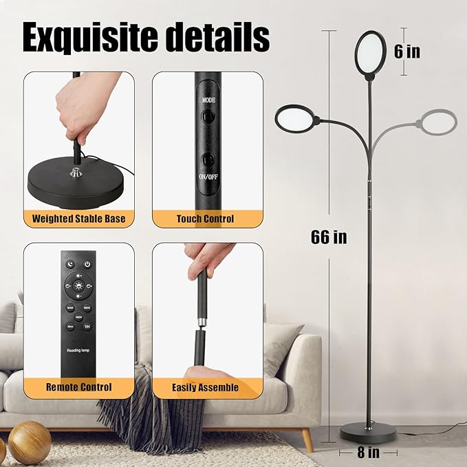 - 【Remote & Touch Control】Our dimmable LED standing lamp includes advanced RF remote control with an impressive range of around 49ft, allowing you to adjust lighting from various rooms. The magnetic remote control can stick to the metal pole, wall plate, or fridge, making it easier to be reached. When the reading floor lamp remote is out of power, the touch switch comes to the rescue.