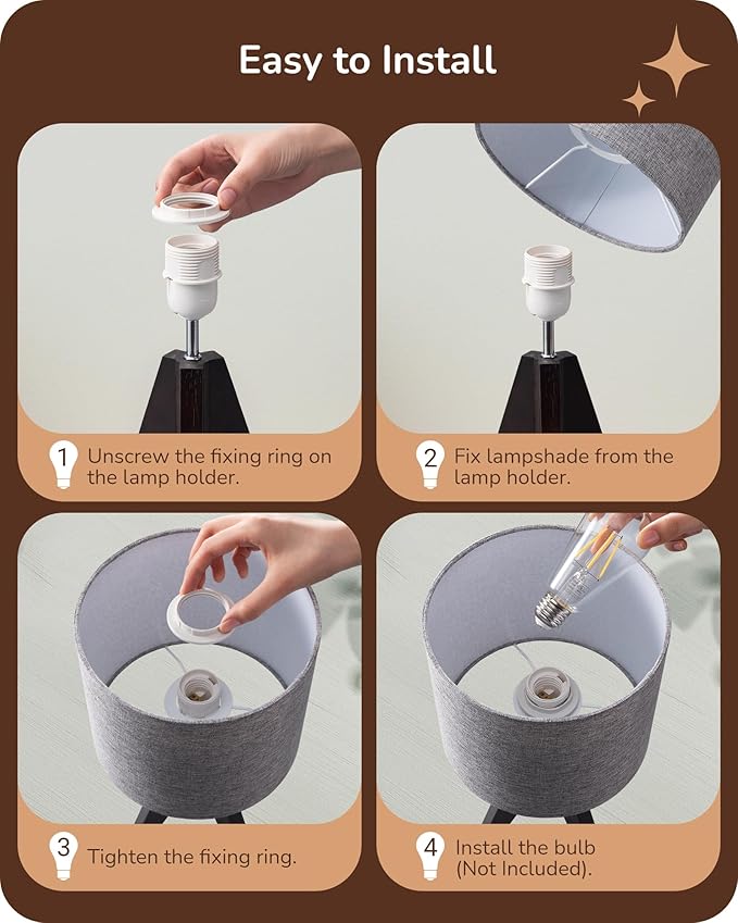 - [Easy to Install] Very easy to put together in a few minutes, just tighten the shade, socket ring, and tripod base and it's easy to turn ON/OFF by the switch on the cord; equipped with E26 sockets, the table lamp for bedroom works well with Incandescent/ LED/ CFL/ halogen bulbs (bulbs not included)