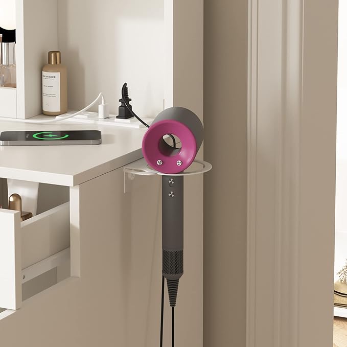 - 【Powerful Capacity Space】 With 6 open shelves, 3 makeup trays and 4 large drawers & 2 side cabinets, this spacious and elegant vanity table set can easily hold all of your cosmetics, blow dryer and jewelry, hair straightener, also deep enough for lotions. Generous style and soft white, can match various rooms and cloakrooms.