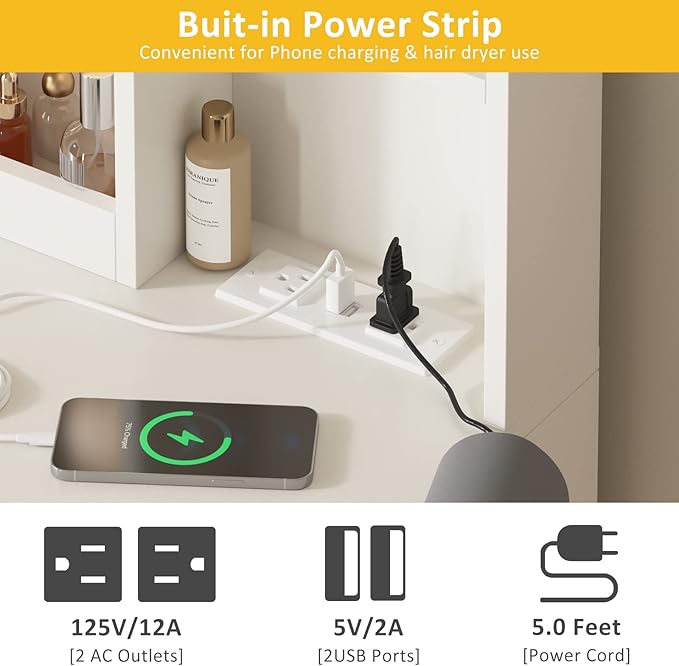 - 【2-in-1 Functional Design with Charging Station】Open storage rack for easy access, large capacity drawer cabinet, with adjustable height laminates, perfect combination of vanity & cabinet. This makeup desk is also equipped with power outlets and USB ports to let you charge your phone, computer and other electronic devices at the same time.