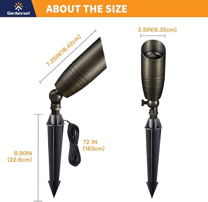 - Solid Brass Construction - The Gardenreet landscape spotlight with solid die-cast brass construction is more durable and reliable than aluminum and plastic fixtures; bronze landscape lights will not rust, age, or peel over time and last a lifetime with a single installation.High-end brass finish, Classical glossy colors that shine in the light and make you win the praise and envy of neighbors