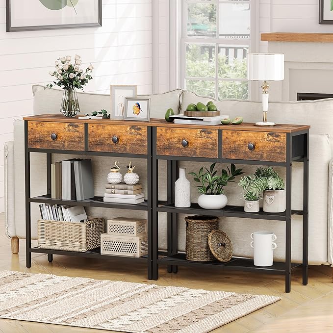 HOOBRO 29.5" Narrow Console Table with 2 Fabric Drawers, Sofa Table, Small Entryway Table with 3-Tier Storage Shelves, Behind Couch Table, for Living Room, Hallway, Rustic Brown and Black BF72XG01