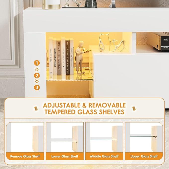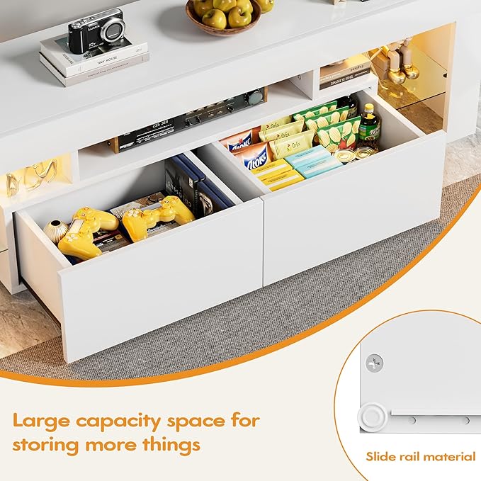 - Sufficient Storage: Two glass shelves and two drawers provide plenty of storage space for your decorations or other items such as snacks, daily necessities and so on. And the shelf above the drawers can be used for place your game consoles or DVDs.