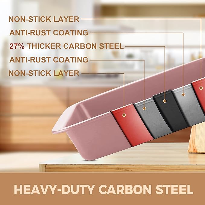 - PREMIUM EXTRA-THICK MATERIAL - With 27% thicker carbon steel, this durable baking sheet set for the kitchen is constructed from heavy-gauge carbon steel for stability, even heat distribution, and durability for years to come. Warranty against peeling off with heat-resistance temperature: 450℉