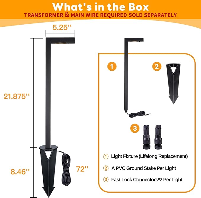 - Easy to Install: Transformer required. Simplify your outdoor lighting setup with our 22" tall decorative wired path light. Comes with a PVC ground spike, 72" Spt-1W 18 gauge copper wire, and two connectors. Simply secure the PVC stake into the ground and connect the wire to the main cable from your transformer (not included) using the connectors we provide