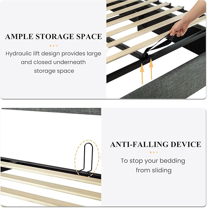 - Lifting Mechanism Design: With hydraulic lifting mechanism, you are able to pop up the platform effortlessly. No worries about the mattress sliding with the protective device back the frame