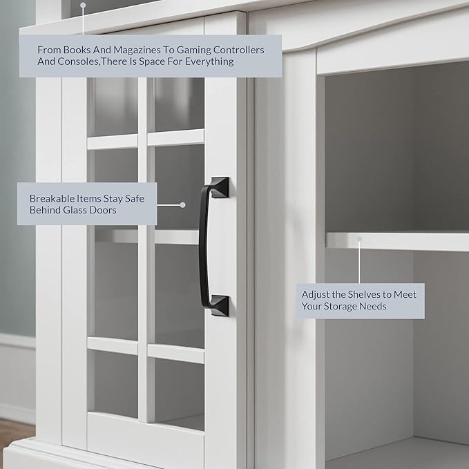 - [ENTERTAINMENT CENTER WITH STORAGE] Two adjustable open shelves for electronics and media accessories with cut-out holes for easy wire access. Two enclosed cabinets offer ample organized storage space with adjustable shelves.