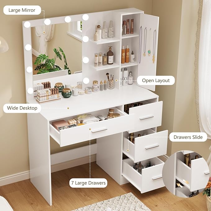 - 【Hidden Necklace Hooks】You never imagine there are 4 hooks behind the cabinet door on the right side of the dressing table, which provide an excellent habitat for your necklaces, rings, and headbands, The 3 hidden shelves behind the cabinet door have seven adjustable positions, providing privacy for your jewelry while also keeping them away from dust