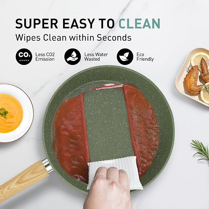 - Non-Stick Granite Coating: Our pan set interior & exterior is coated by high performance non-stick granite coating, which makes the skillet easy to cook and clean. It means less oil or butter using for healthy and better diet cooking