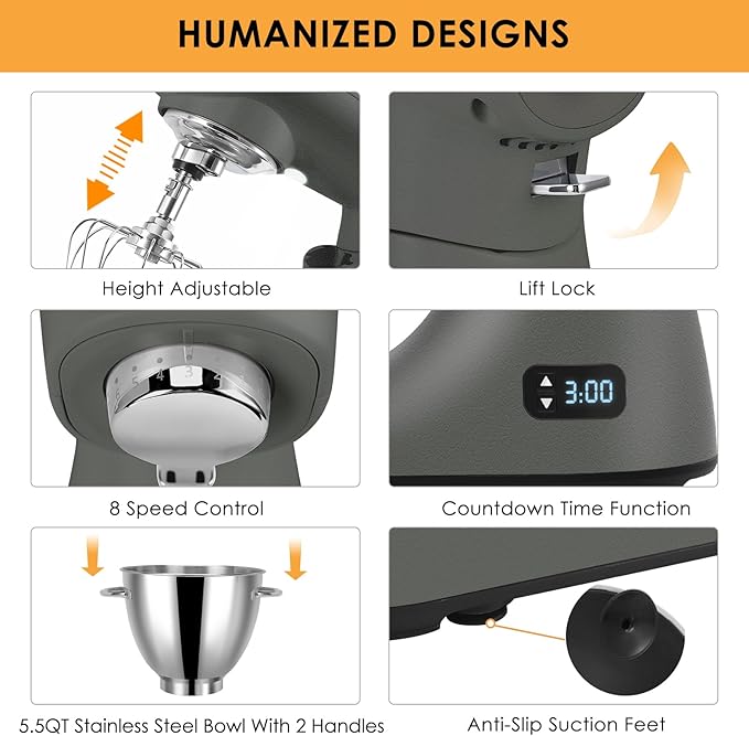 - 【6 Ingenious Designs for Easy to Use】1.All accessories of the mixer for baking are dishwasher safe. 2.The tilt-head design of the electric stand mixer is easy to adjust. 3.The lighting of cake mixer is convenient to check the mixing status. 4.The low-noise high-torque DC motor makes the mixing sound less than 70 dBa. 5.The 8-level constant speed control is suitable for various recipes, and knob adjusts smoothly. 6.The display screen shows the mixing time and can be timed.