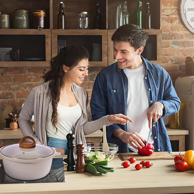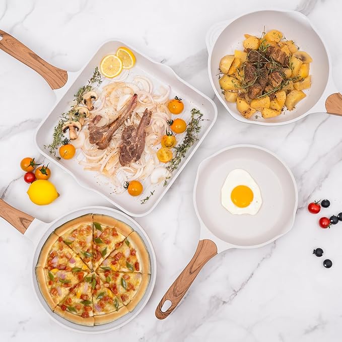 - Professional-Grade Performance: Engineered with reinforced aluminum core, this beige chef-crafted pots and pans set delivers restaurant-quality results. Withstands 464°F all stovetops including induction, ceramic, gas & electric stove