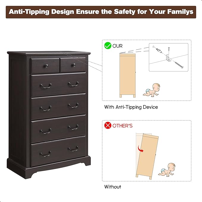 T4TREAM 6 Drawers Dresser Chests for Bedroom, 48" Tall Rustic Chset of Drawers, Wood Dressers Organizer for Bedroom, Living Room,Hallway, Espresso