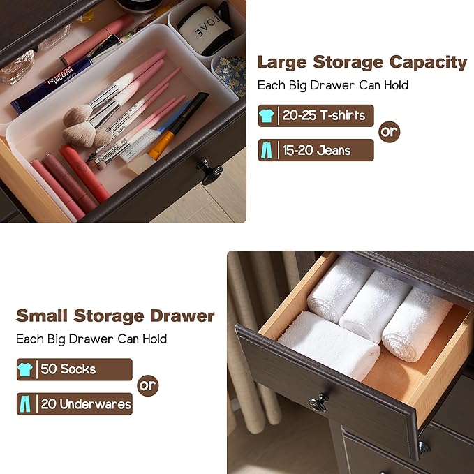 - 【Sturdy & Durable】The bedroom dresser is made from FSC-Certified wood for long term use, scratch resistant. No strong odor.The widened dresser legs made the dresser does not slide easily, provide great durability and stability.
