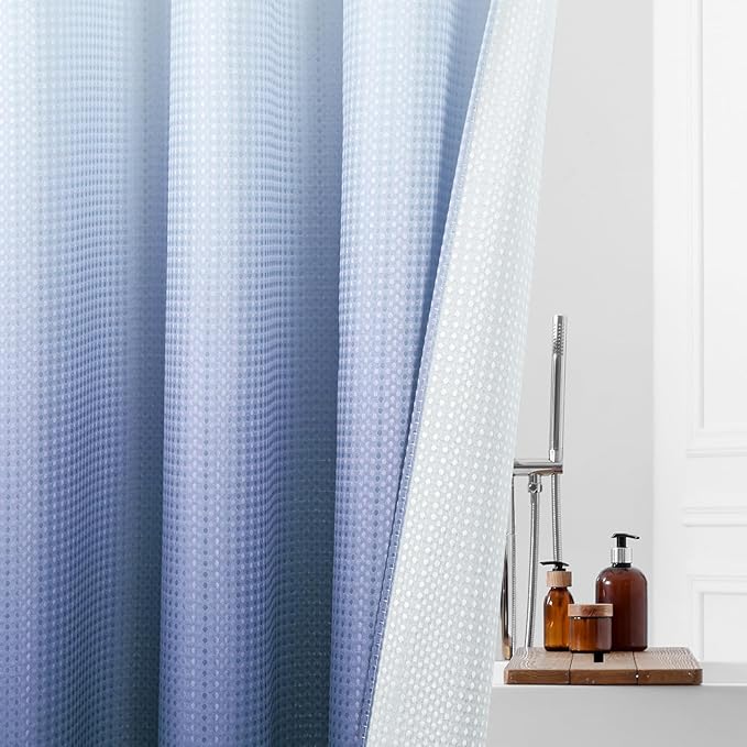 - Heavy Duty Fabric - High quality waffle woven fabric & waterproof snap-in liner create hotel grade effect for this navy ombre shower curtain, so that it could keep in place. The quality curtain is elegant and soft, which can deliver a spa-Like bathroom environment.