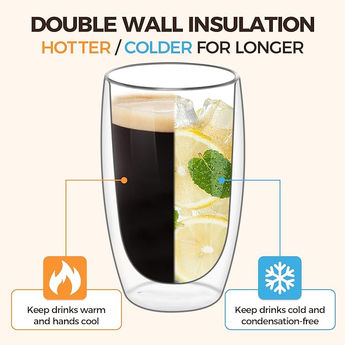 ComSaf 15oz Double Wall Glass Coffee Mugs, Insulated Latte Cups Set of 2, for Coffee, Espresso, Tea, Milk, Clear Cappuccino Cups Set Glassware Gift for Christmas Birthday