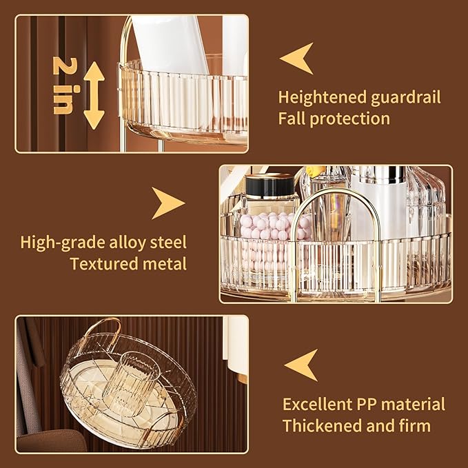 - 【360° Rotation】: The large-capacity makeup organizer allows you to store your cosmetics and skincare products in a clean and orderly space, 360° smooth rotation allows you to quickly find what you need, It's very convenient. The raised edges prevent cosmetics from falling off during rotation.