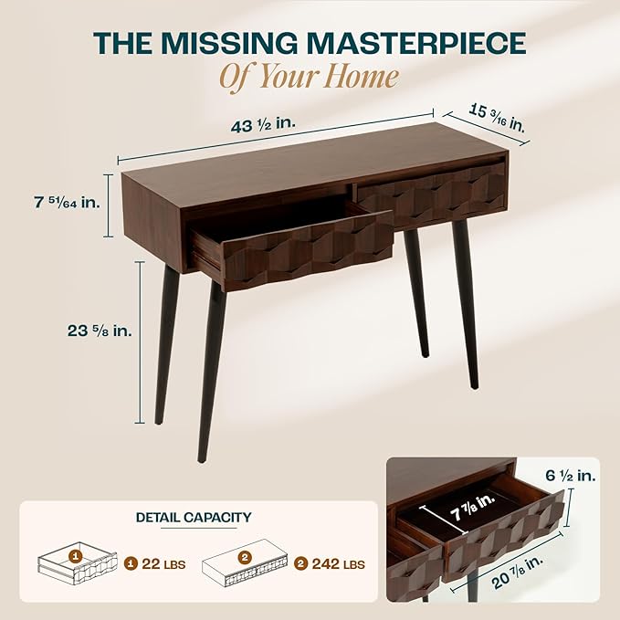 - BUILT TO LAST: Crafted from solid wood and metal legs, our console table with drawers creates an ideal blend of elegance and durability; With adjustable levelers, this wooden hallway table ensures stability, offering a lasting addition to your home