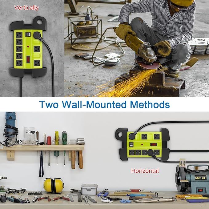 - Metal industrial power strip with green aluminum housing and black outlets, wall mountable and built-in usb ports design, perfect for hooking up all the gadgets at work.