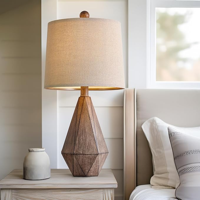 - Deep Brown Vintage Design - The deep brown resin wood grain base is designed in unique irregular diamond shapes for a vintage appeal. The oatmeal linen shades and knob switch add a touch of nostalgia to your home. Brighten up your house with this charming set of 2 retro farmhouse table lamps.