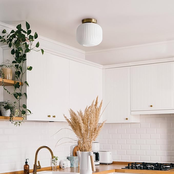 GLOBE Electric 66000079 1-Light Flush Mount Ceiling Fixture, Matte Brass, Frosted Ribbed Glass Shade, Kitchen Island Lighting, Dining Room Fixture, Modern Home Decor for Living Room