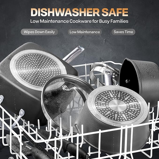- EASY TO CLEAN: Make cleanups quick and effortless with Granitestone Armor Max- The ultra nonstick 4 Layer coating is constructed to provide an effortless wipe down after use. Each piece of cookware is dishwasher safe allowing you to simply throw your cookware in the dishwasher for a 1,2,3 cleanup.