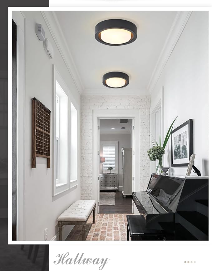13 Inch Flush Mount Ceiling Light,Black Finish Plate with Frosted Glass Shade,Round Ceiling Lighting Fixture for Hallway Bedroom Closet Livingroom Kitchen Stairwell (Black)