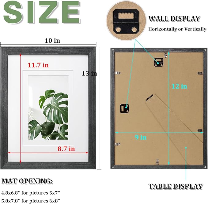 - DIMENSION: Overall dimension is 10x13 inch, back opening size is 9x12 inch, front opening size is 11.7x8.7 inch. Mat opening size is 4.8x6.8" for 5x7 pictures and 5.8x7.8" for 6x8 pictures. Perfect for decorating any room in your home or office. Great gift for wedding, party, festival, Father's Day, Mother's day and friend birthday.